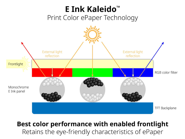 Lo schermo a colori E Ink Kaleido™ combina il classico pannello in bianco e nero E Ink con la tecnologia a matrice di filtri colorati (Color Filter Array, CFA). Al pannello monocromatico E Ink viene applicato uno speciale filtro RGB, che permette a E Ink Kaleido™ di visualizzare fino a 4096 fra colori e sfumature.